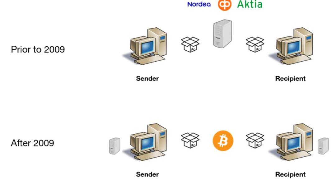·??比特幣協議是繞過中介的解決方案。無需信任的第三方,Internet上的資金就變得安全了,跨境交易變非常有效率。