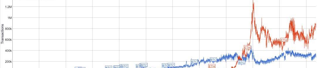 來源:Bitinfocharts.com,《每日比特幣/以太坊的確認交易》。