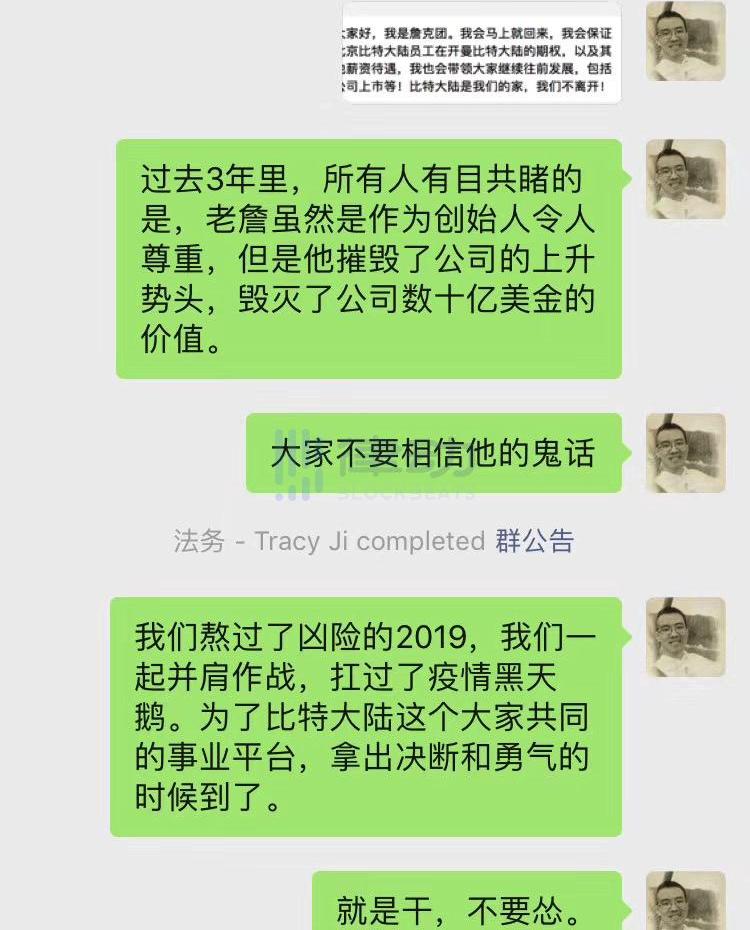 而引起吳忌寒評論的則是一張詹克團的言論截圖,截圖內容為:大家好,我是詹克團。我會馬上就回來。我會保證北京比特大陸員工在開曼比特大陸的期權,以及其他薪資待遇,我也會帶領大家繼續往前發展,包括公司上市等!比特大陸是我們的家,我們不離開!
