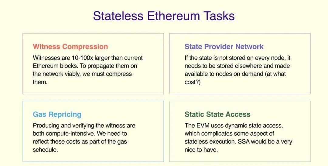 而實現無狀態以太坊要完成四件事:壓縮區塊見證數據、形成狀態提供者網絡、交易的Gas耗用量重定價、實現狀態的靜態訪問模式。