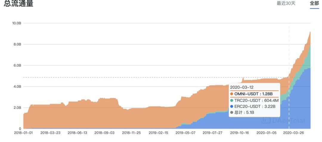 據DAppTotal數據顯示,「3.12」以來,USDT總流通量也出現顯著增長,當前市場流通供給量為87.9億美金。