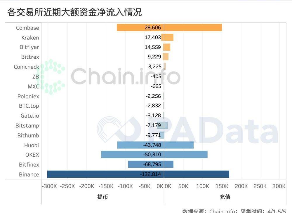 而Bitfinex、Coincheck、Bittrex、Bitflyer、Kraken和Coinbase的情況則相反,這6家交易所的大額凈流入額要大于其統計期內余額變化,這說明這些交易所的散戶提幣較多,增加了資金外流。