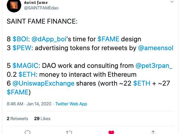 比如,SaintFame?是一個基于DAO的時裝店,通過收集可贖回代幣,它能夠像互聯網本地公司一樣運營。SaintFame的成員能夠集體共同決定何時以及通過何種方式來使用該組織持有的代幣,包括使用代幣來承包工作、獲得社交媒體廣告以及從其時裝產品的銷售中獲得的收益。