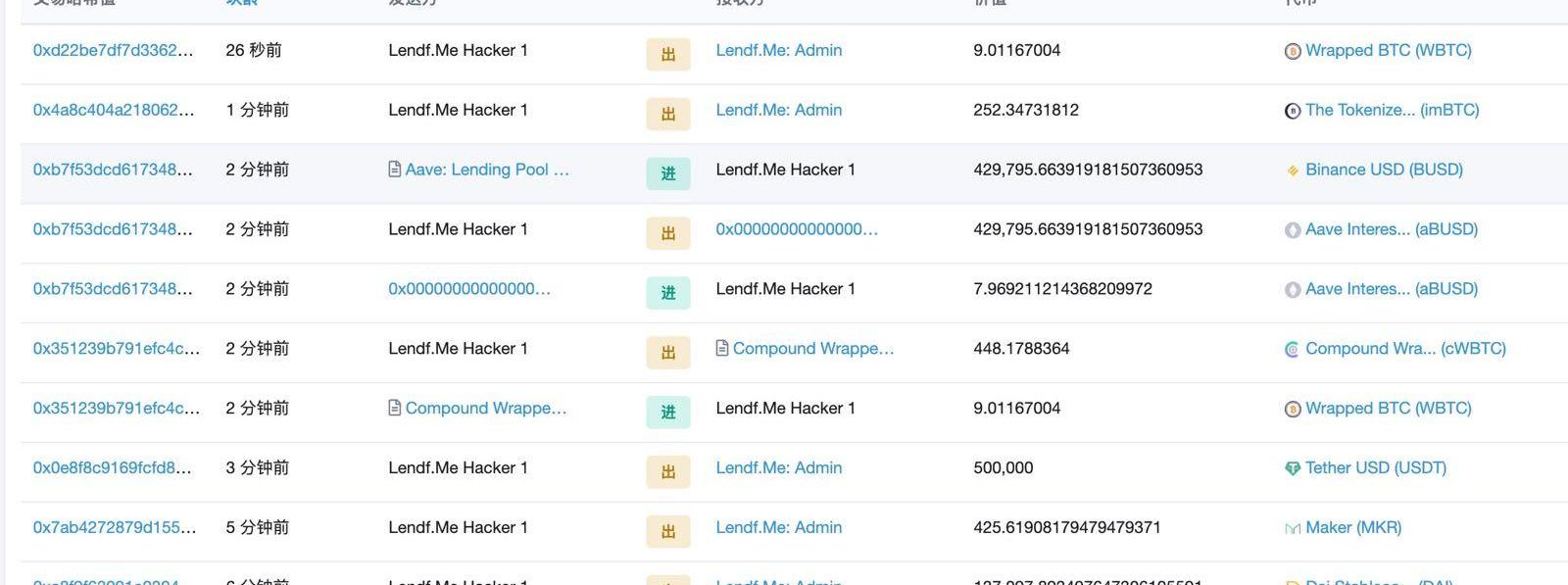 北京鏈安Chainsmap監測系統發現,北京時間4月21日13點33分起,盜取Lendf.ME的黑客向Lendf.ME歸還幾乎所有盜竊的代幣,包括57,992枚ETH,425.61枚MKR,13.7萬枚DAI,50萬枚USDT,252.34枚imBTC,等等。