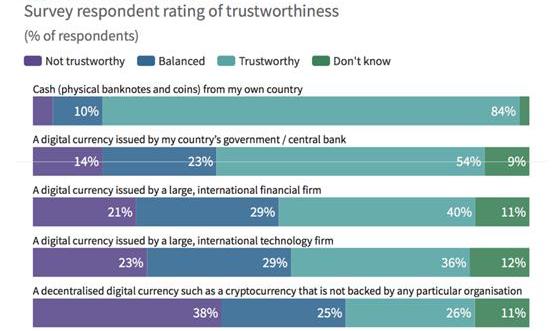 調查發現,人們對央行支持的數字貨幣的信任度最高,對大型金融公司發行的數字貨幣的信任度位居第二,對大型科技公司的信任度略低。受訪者表示,他們會信任銀行、大型企業——無論是科技企業還是金融企業——而不是像比特幣這樣沒有任何特定組織支持的去中心化數字貨幣。