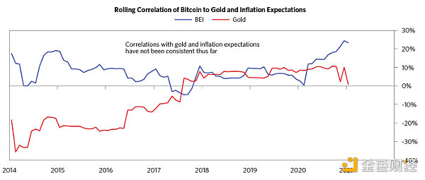 比特幣只有不到11年的歷史,還沒有足夠的證據證明比特幣能夠讓人們認為它可以像黃金一樣在未來成為可靠的多樣化投資選擇。盡管如此,我們依然研究了市場上的現有數據,旨在了解比特幣在對沖通脹和投資組合縮水方面所扮演的角色和作用。如下圖所示,2021年,隨著通脹預期的上升,比特幣普遍升值,但相比于長期扮演通脹角色的黃金,比特幣似乎相對較弱。
