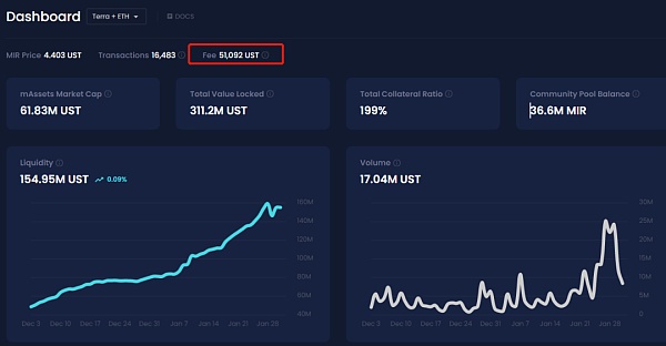 MIR 除了用于參與治理,當用戶銷毀鑄造的合成資產取回抵押物時,將會收取 1.5% 的協議費,費用將會分配給 MIR 利益相關者。在收入方面,官網顯示 24 小時費用收入為 5.1 萬美元,按此計算每個月將有 150 萬美元的費用收入。