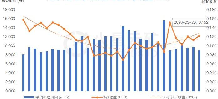 比特幣全網難度在3月9日短暫上調至16.55T創歷史新高,全網算力隨后下滑,出塊時間隨算力下降而增加,單位挖礦收益下降;3月12日比特幣暴跌,導致單位挖礦收益大幅下跌,部分礦機入不敷出而關機,全網出塊繼續減少,自平均每T產出0.0000167BTC下降至0.0000155BTC左右。