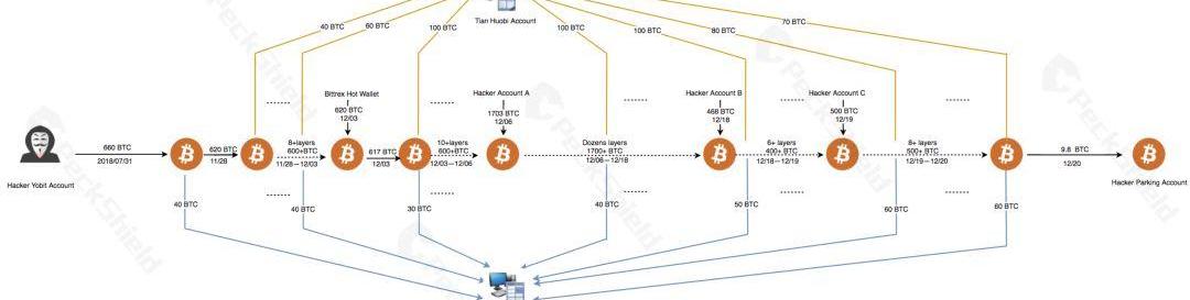 分析發現攻擊者試圖利用PeelChain的技術手段將手里的資產不斷拆分成小筆資產,并將這些小筆資產存入交易所,如下圖所示: