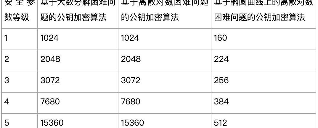安全參數是一個衡量密碼學算法保護隱私數據強度的數值。對位于“同一等級"的安全參數值來說,不同密碼學算法的安全級別基本相同,即面對已知最有效的攻擊方式,算法被破解導致隱私數據泄露的概率相同。