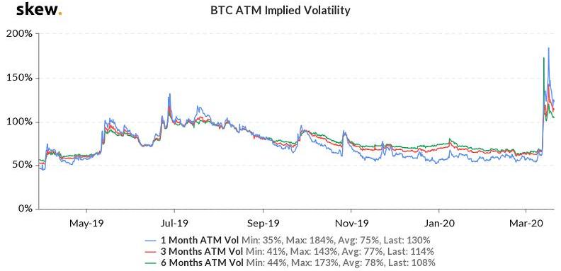 與分析師預測比特幣與傳統股市的非相關性一樣,數據提供商Skew強調了市場的波動性正日益加劇。比特幣的隱含波動率已達到最高水平,3月份平值期權波動率為235,日波動率為12%。