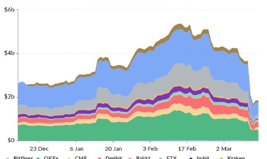比特幣價格的劇烈下跌造成期貨合約市場的大量爆倉。據AICoin數據,比特幣的爆倉總金額超過15億美元,爆倉人數超過10萬人,達到了歷史單日最高。下圖6是主要期貨市場的比特幣交易量,可以看出,3月12日和13日兩天的交易量明顯高于日均交易量。