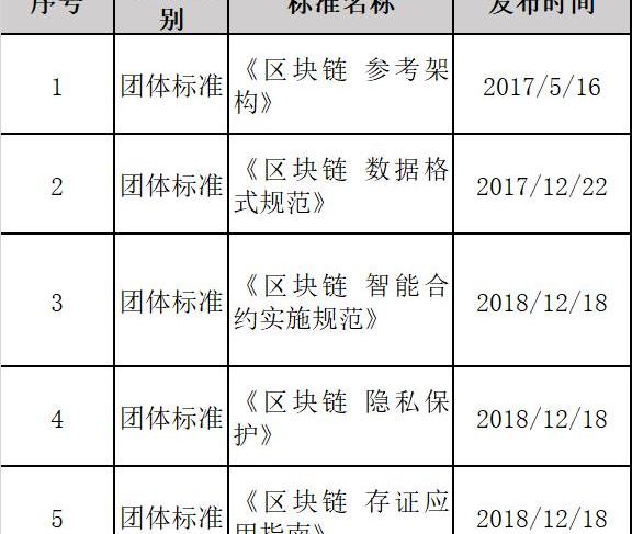 在工信部2018年6月公布《全國區塊鏈和分布式記賬技術標準化技術委員會籌建方案公示》中,提出了基礎、業務和應用、過程和方法、可信和互操作、信息安全等5類標準,并初步明確了21個區塊鏈標準化重點方向和未來一段時間內的區塊鏈和分布式賬本技術國家標準體系表。