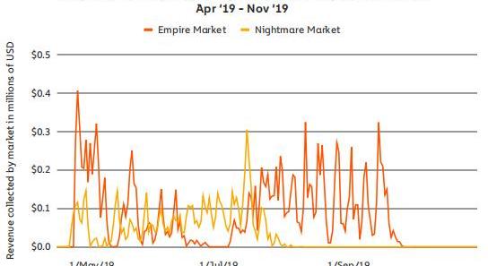 Nightmare市場是一個短暫的、中等受歡迎的市場,于2019年7月23日關閉。與我們之前提到的其他例子不同,Nightmare并沒有被執法部門取締。目前還不清楚究竟發生了什么,但7月23日之后用戶紛紛逃離。到7月底,Nightmare的交易幾乎完全停止。正如下面的數據顯示,Empire接手了Nightmare以前的大部分業務,因為它的銷售額在Nightmare下跌時顯著增長。