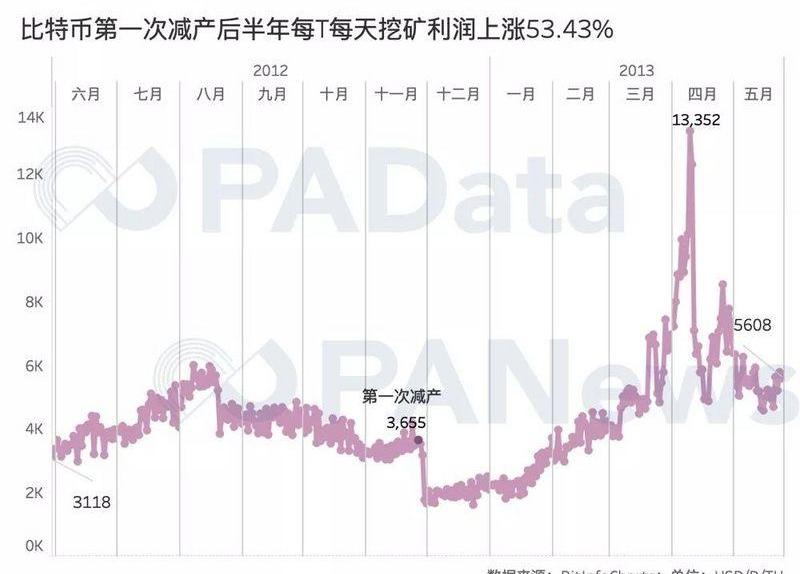 根據統計,2012年第一次減產時,比特幣的幣價為12.2美元,減產前半年的漲幅約為134.62%。減產后半年,比特幣的幣價達到了128.8美元,漲幅約為955.74%,最高達到了230.7美元,最高漲幅約為1790.98%。