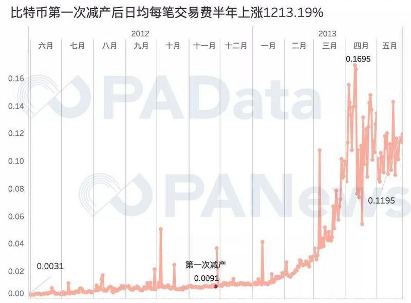 根據統計,比特幣第一次減產時日均每筆交易的交易費大約為0.0091美元,減產后半年漲至0.1195美元,漲幅達到1213.19%,最高漲幅達到1762.64%。