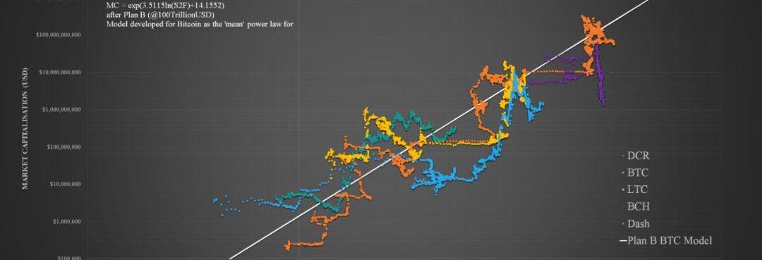 另一位分析師Checkmatey另辟蹊徑,由于產量減半并非比特幣獨有的現象,因此他選取其它有產量減半規律的數字貨幣,如BCH、LTC,分析其市場規模和S2F的關系,結果發現,其他減半幣的市值變化依然可以用S2F進行解釋。