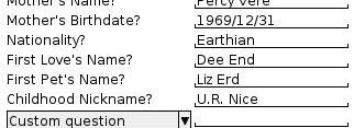 而當沒有生物識別技術時,一組通常只有用戶知道的諸多問題的標準表單,可被用于生成用戶的秘密數據。所有可選的默認字段有:FullName、BirthDate、MotherName、MotherBirthdate、Nationality、FirstLove'sName、FirstPet'sName、ChildhoodNickname。