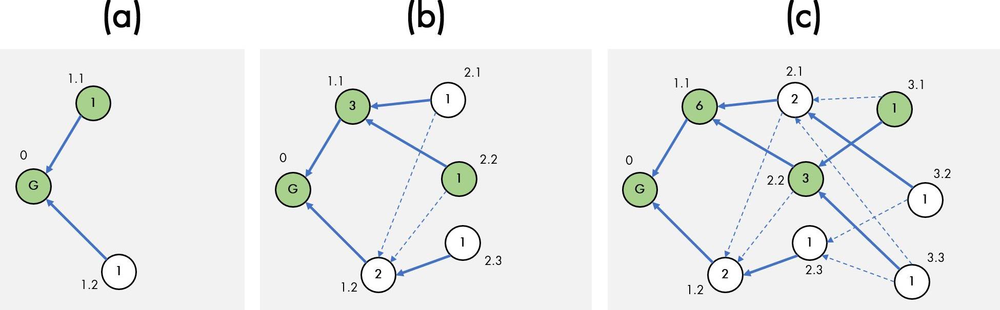 (a)兩個區塊(1.1和1.2)指向第一個創世區塊(0),粗線是幽靈指針,因為只有一個父區塊存在而這兩個區塊都指向它。現在的順序是模糊的,但是我們可以使用最低的哈希進行比較,假設(1.1)獲勝,并被認為是未來區塊的幽靈指針的候選。