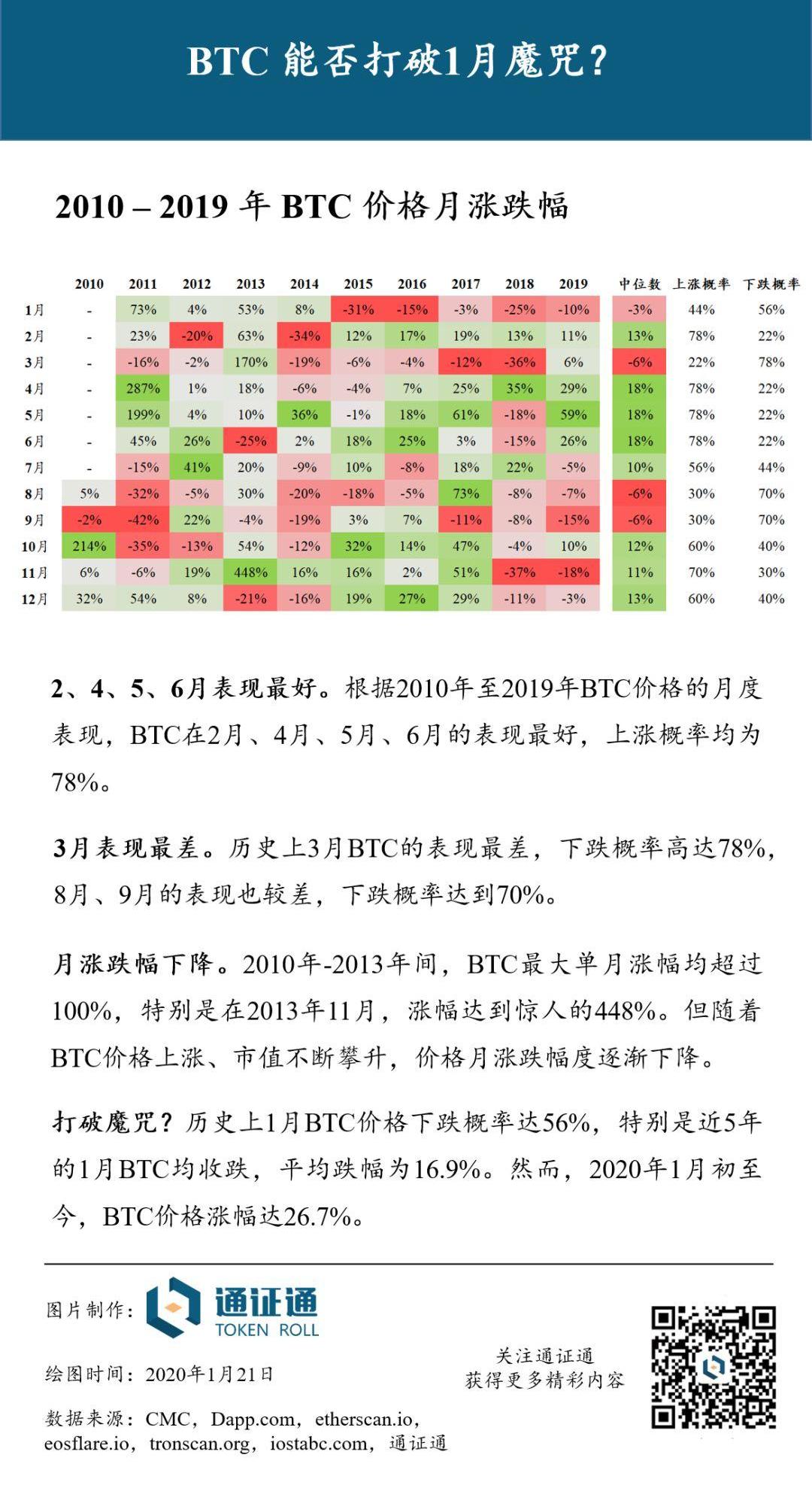 2、4、5、6月表現最好。根據2010年至2019年BTC價格的月度表現,BTC在2月、4月、5月、6月的表現最好,上漲概率均為78%。