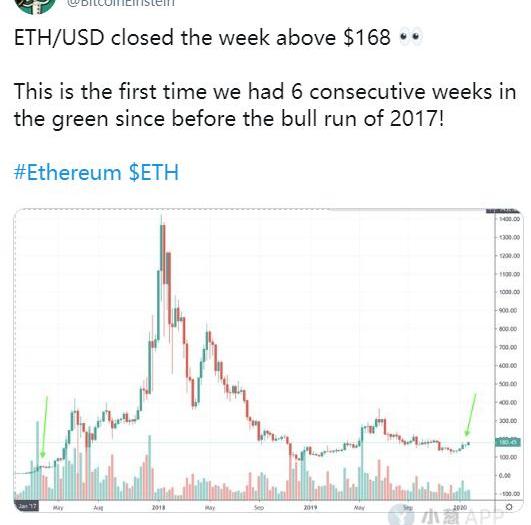至于后市ETH走勢如何,加密貨幣分析師CryptoEinstein指出,以太坊在過去一周的收盤價高于168美元。他補充說,近兩年來,以太坊首次出現連續六周收陽,他傾向于相信以太坊的牛市已被確認。