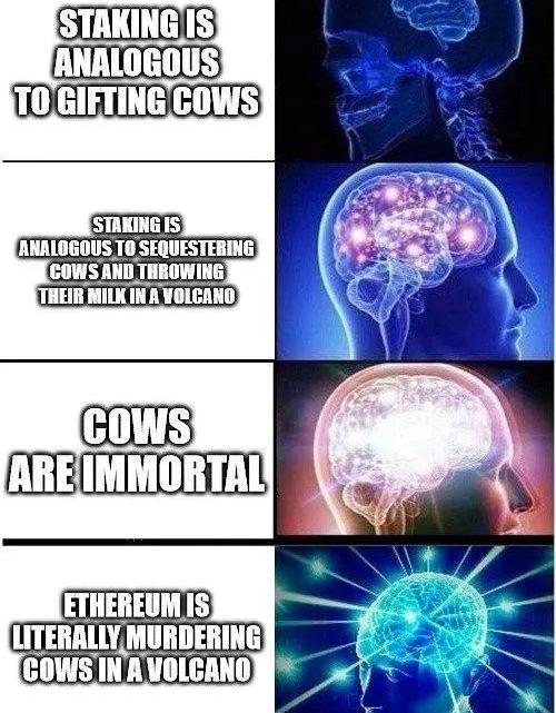 回到最開始這張圖片,我之所以覺得搞笑是因為它調侃了權益證明只是拙劣地給工作量證明披了一層皮。