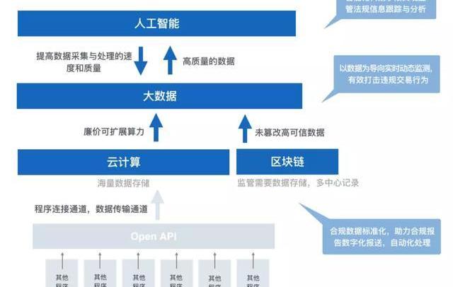 監管科技的核心5大技術是ABCD+API,人工智能,區塊鏈,云計算,大數據和API,5大技術相互融合,貫穿于整個監管流程。五大監管科技之間的關系如下圖: