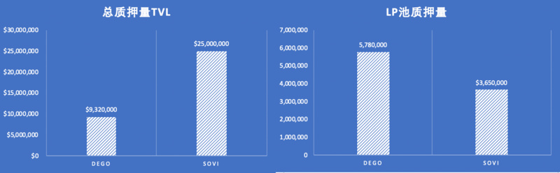 對比DEGO和SOVI這兩個開啟了流動性挖礦的項目,新興項目SOVI的總鎖倉量TVL是DEGO的三倍。在LP池質押量中,在DEGO上DEGO-ETH和DEGO-UNI的LP池質押量為578萬美元,在SOVI上SOVI-USDT和SOVI-WHT的LP池子質押量為365萬美元。
