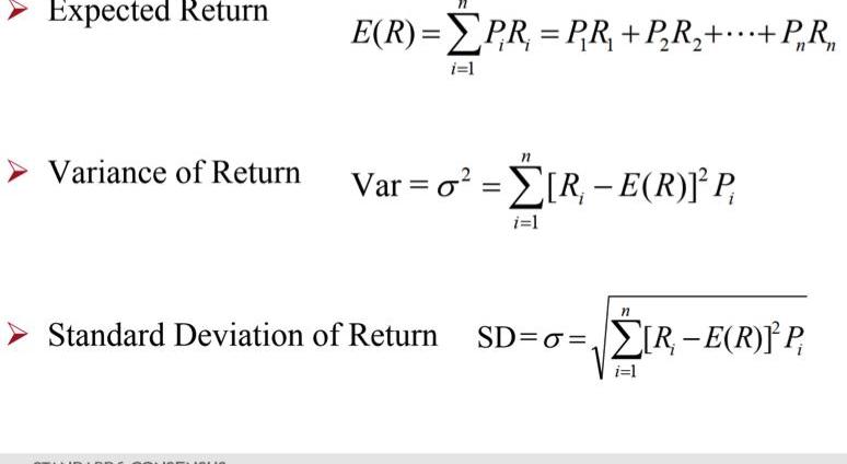 風險的定義是預期回報的不確定性。標準差被解釋為度量風險的指標。數學表達公式是: