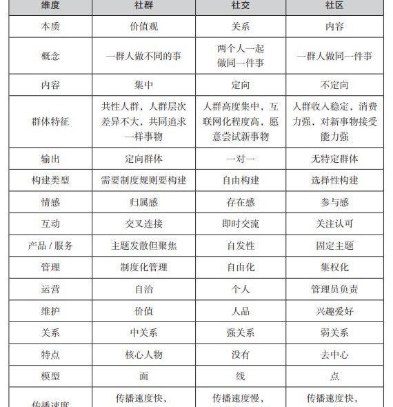 社交是人類與生俱來的需求,有人的地方就會有社交。互聯網社區是在社交基礎上,通過一定的形式和鏈接形成的,以內容、話題、興趣為中心的群體組織。隨著技術的演進和時代的發展,如表22-1所示,社群靠制度化管理,輸出面向定向群體,人與人之間的互動是交叉連接的關系等特點,都使社群取代社區不可避免。
