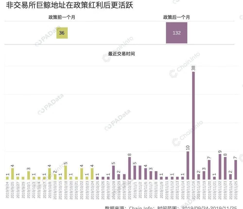 不過值得注意的是,在10月25日前后幾天的窗口期內,非交易所“巨鯨”地址的活躍度與平時并沒有顯著差異,反而是在11月16日,38個“巨鯨”地址出現交易動向,是單日出現“巨鯨”最多的一天。