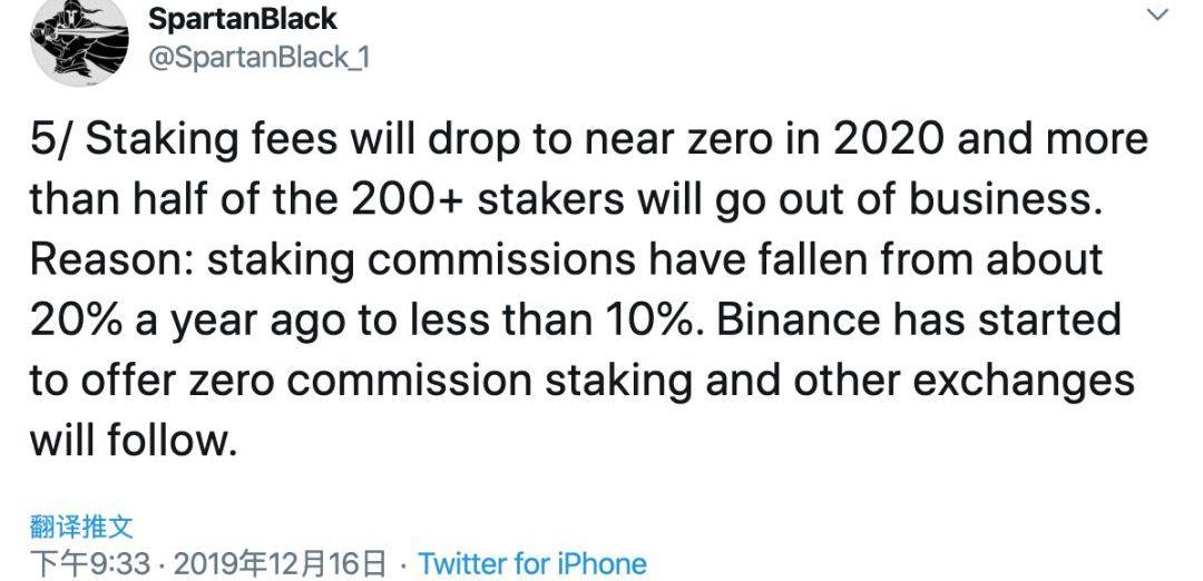 5、Staking手續費將降至0,200多個質押服務商(Stakers)里有一半將破產。理由是Staking委托的傭金已經從一年前的20%下降到了10%,幣安開始提供0手續費Staking服務,其他交易所會跟進。