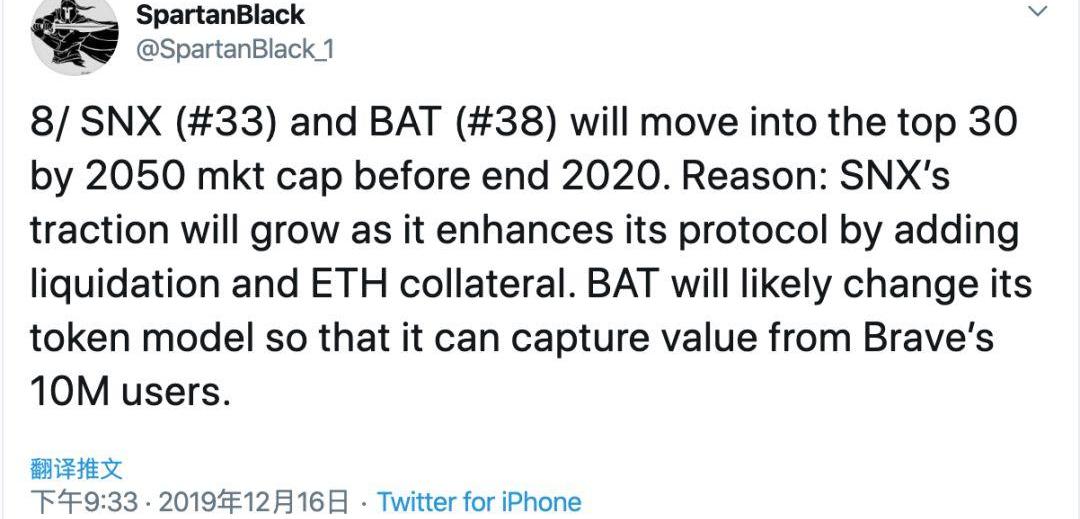 8、SNX和BAT將進入「2050市值」排名前30。理由是SNX將會增加清算和以太坊抵押來增強其協議,這會增加SNX的吸引力;BAT很可能會改變它的代幣模型以捕獲Brave1000萬用戶的價值。
