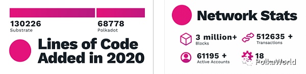 2020 年波卡主網正式上線,產生了超過 300 萬的區塊,并進行了 18 次無分叉線上升級。Parity 和社區開發者一同為 Substrate 貢獻了超過 12 萬行代碼和 Polkadot 貢獻了超過 6 萬行代碼。通過基金會,我們共資助超過 200 多個遍及各個方向的項目。同時 Polkadot 財政和 Kusama 財政也已經為超過 60 項提案資助了超過 11 萬 DOT 和 6 萬 KSM。同時我們也關注到市面上越來越多的投資機構成立以 Polkadot 為中心的生態系統基金支持波卡生態。
