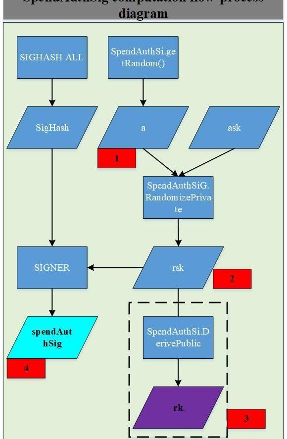關于spendAuthSig的意義,可在兩種場景下,進行描述。第一:txsender自己產生zkproof,然后對spendDescription進行簽名。這時,如果存在一個攻擊者,想對spendDescription進行重放攻擊,則其需要重新簽名,則rk會被替換,那么驗證者在驗證spendzkproof時,就會驗證失敗;如果攻擊者不替換rk,那么spendAuthSig的驗簽就會失敗,因此spendAuthSig的存在,有效規避spendDescription的重放攻擊;第二:txsender調用第三方產生zkproof,然后自己對spendDescription進行簽名,這是Sapling版本允許的,為了讓內存和計算能力受限的一些錢包也能支持隱私交易,即使這樣損失了隱私性,因為需要把auxiliaryinput全部發送給第三方。因此,在這種情況下,為了不讓第三方惡意產生有效的zkproof,txsender需要對spendDescription進行簽名,需要注意的是,txsender簽名用的是ask,zkproof中spendAuthority的證明用的是ak,因此第三方無法產生有效的簽名,有效規避spendDescription的重放攻擊。spendAuthSig的簽名流程如下圖所示: