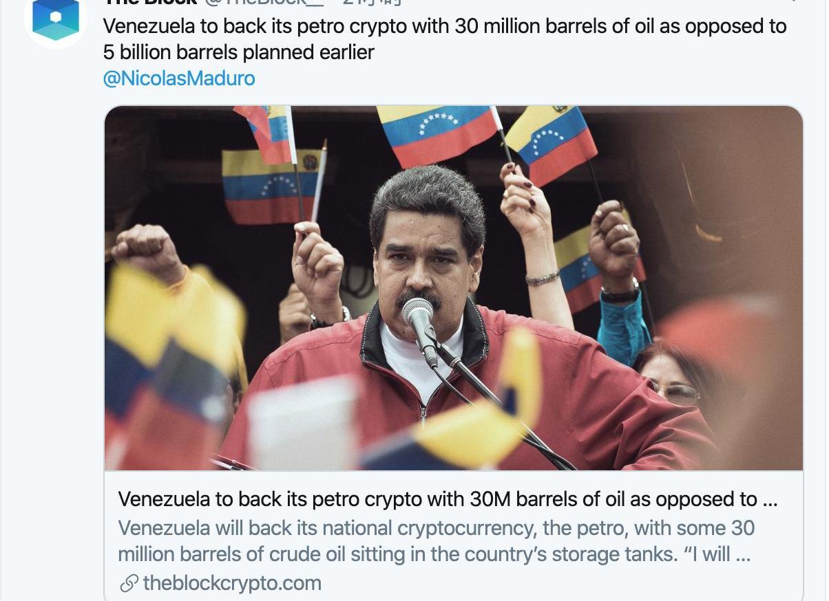 1、TheBlock報道,委內瑞拉宣布將用3000萬桶石油來支撐其國家數字貨幣石油幣thepetro,遠低于2018年2月發布石油幣時所說的50億桶石油。