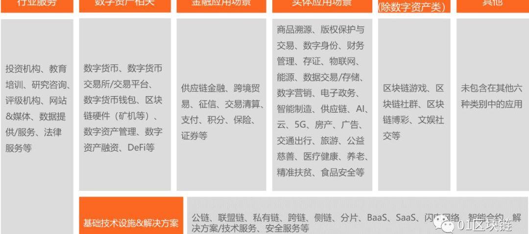 結合區塊鏈產業發展情況,零壹智庫將區塊鏈產業劃分為七個一級行業,分別是基礎技術設施&解決方案、數字資產相關、金融應用、實體應用、其他鏈上應用、行業服務和其他等,其中,七個一級行業中共計包含60多個二級行業。