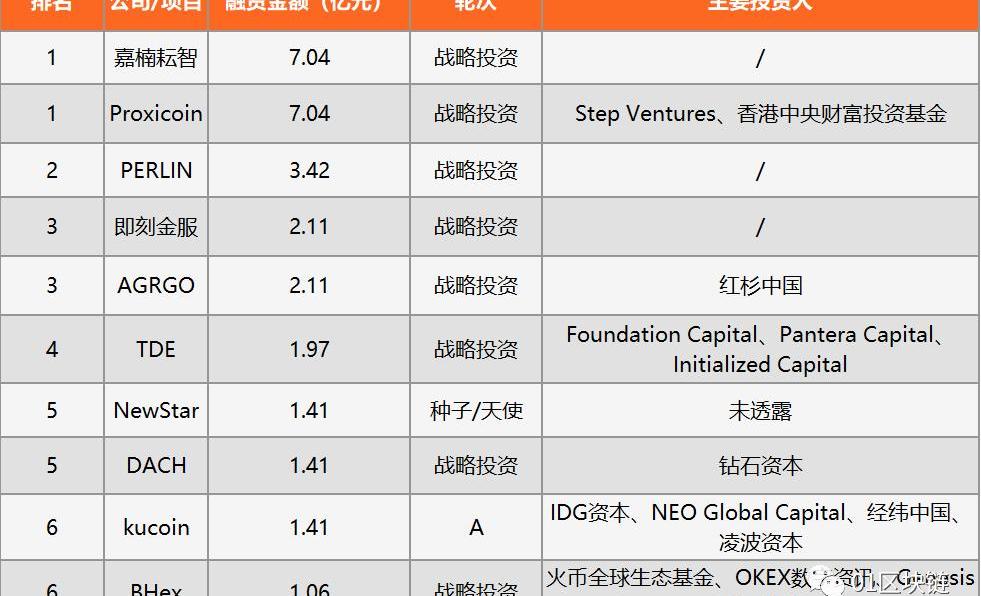 “礦機巨頭”嘉楠耘智和加密貨幣項目Proxicoin并列融資金額Top10第一位,融資金額達7.04億元;公鏈項目PERLIN排在第二名;投融資服務平臺即刻金服和區塊鏈開源平臺AERGO位居第三位;投資機構TDE獲得1.97億元戰略投資,排在第四位;排在第五位的分別是文娛社交項目NewStar、車輛數據服務平臺DACH和加密貨幣交易所kucoin;加密貨幣交易所BHex獲得火幣全球生態基金、OKEX數字資訊和GenesisCapital的1.06億元投資,位居第六位。