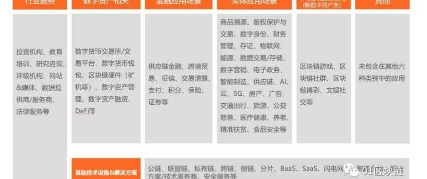 首先,區塊鏈技術逐漸完善,市場體系日益成熟。從以比特幣為代表的區塊鏈1.0,到以以太坊網絡為代表的區塊鏈2.0,再到目前仍處于發展初期的賦能實體經濟的區塊鏈3.0,區塊鏈在提升擴展性等自身性能的同時,也在不斷融入使用場景,在供應鏈金融、食品溯源、數字存證、電子政務等諸多領域得到實際應用。經過十余年的發展,我國以基本形成包括基礎技術設施&技術解決方案、數字資產相關、金融應用場景、實體應用場景、其他鏈上應用、行業服務及其他等七大類為主的產業發展體系。