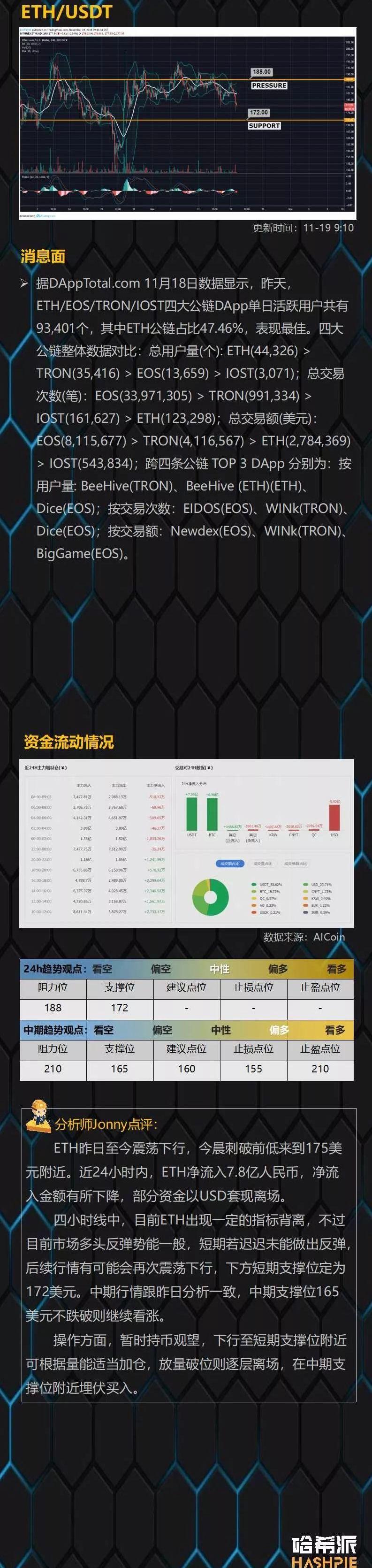 分析 | 大盤昨晚直線拉升后續怎么走?:金色財經分析師認為近期各主流幣在前日下破低點得到周線級別的重要支撐,昨日在平臺幣的帶動下開啟反彈大漲,日線反包形成,短期看漲,預計近日將逐步測試上方壓力位,若能突破大跌后的K線,則宣告調整結束,開啟新一輪趨勢行情,建議拿好手中中長線籌碼,短線可以適當低吸入場。BTC支撐3750/3700,壓力3890/3950;EOS支撐3.5/3.35,壓力3.85/4.35;ETH支撐133/129,壓力140/146;HT在1.62-1.42區間,其他品種同步BTC操作。