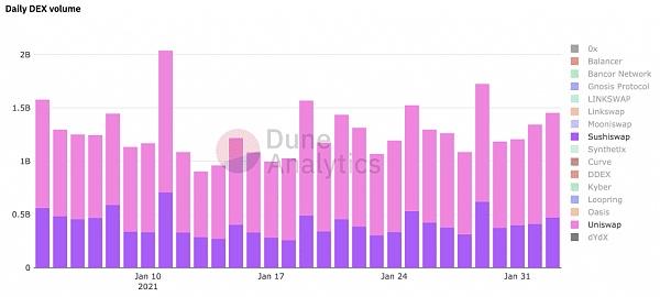 無論如何,盡管缺乏額外的激勵措施,較高的流動性是產品及其市場地位的有力指標。UniSwap仍然是交易者和Token項目的領先交易平臺。然而,SushiSwap在1月底突破了20億美元大關,進一步凸顯了自身的健康發展。