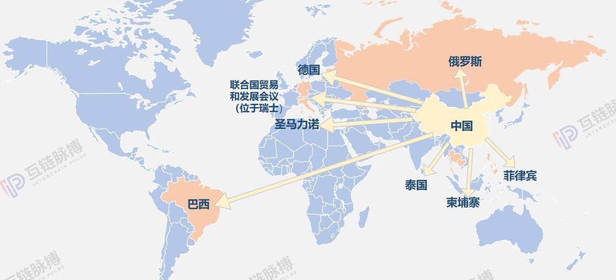 而在這之中,最先受到影響的是我國的周邊國家,北有俄羅斯,南有泰國、菲律賓、柬埔寨,均曾在合作中受到中國區塊鏈技術的支持;此外圣馬力諾、德國等歐洲國家,巴西等拉丁美洲國家也曾受到中國區塊鏈發展的影響。