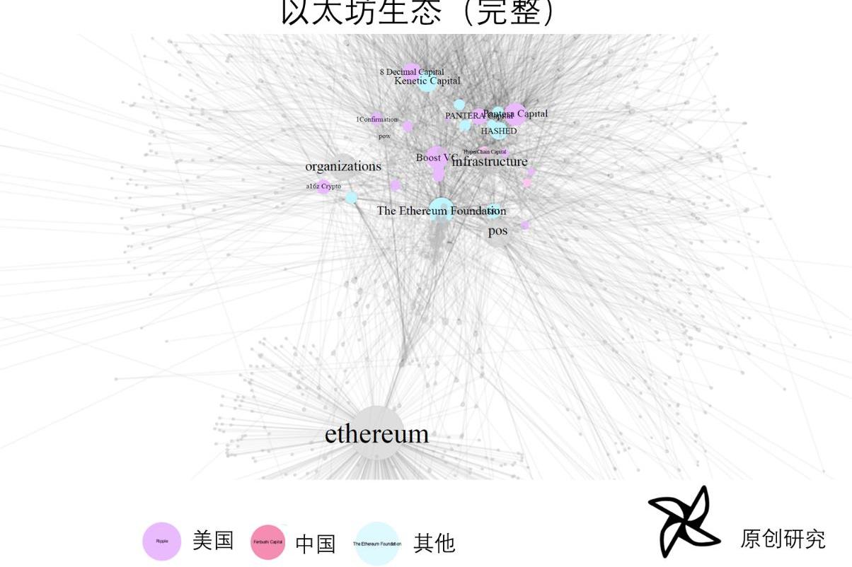 以下是以太坊生態項目、人和資本結合的知識圖譜圖網絡,可以發現美國元素占據主導地位。