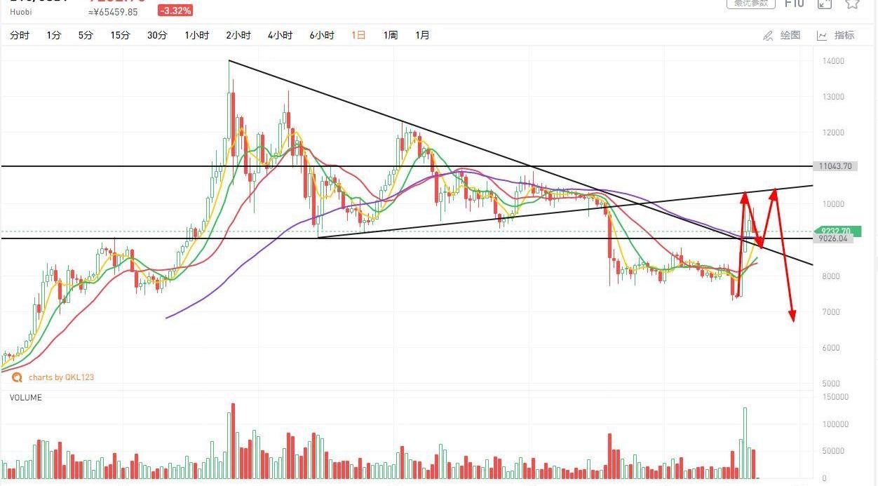 受到人民網辟謠消息的影響,BTC開始出現震蕩走勢,連續的上拉對資金消耗是非常大的,這里出現一定的休整也是可以接受的,目前該標的還是守在下降壓力位之上,最終能否成功站穩下降壓力線,還需再觀察幾日,昨日的成交量已經明顯出現萎縮,表明高波動期已經過去,現在市場已經到達前期的密集成交區,這次并沒有利用消息直接站上該區間,以后再想突破可就難了,接下來還會繼續向下尋找支撐,觀察8800美元附近的支撐是否有效,從我個人的角度而言,我認為本次的事件影響只會影響短期的反彈節奏,并不會影響該標的長期下跌的趨勢,個人傾向于短期內可能會再度試探10350美元的高點,不放量的話,將會再次開啟探底。