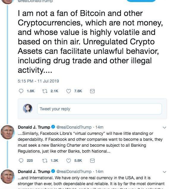 7月11日,美國總統特朗普在推特點評Libra:「Facebook的加密貨幣Libra沒什么地位或可靠性。如果Facebook和其他公司想要成為一家銀行,它們必須尋求新的銀行章程,并像其他銀行一樣遵守所有的銀行監管規定,包括國內及國際性的。」