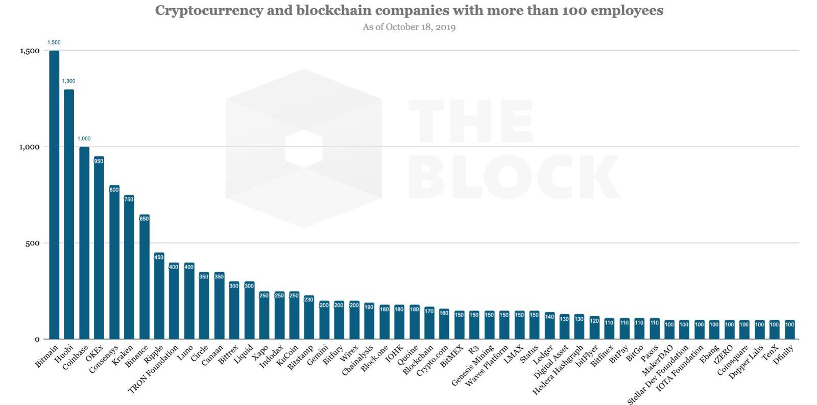 XRP/HKD-2.97%加密貨幣研究機構TheBlock日前對158家專注于區塊鏈和加密貨幣領域的公司進行了分析。結果發現,區塊鏈行業中,至少有50家公司雇傭的員工超過100人。員工最多的是礦機生廠商比特大陸,達到1500人。火幣、Coinbase、OKEx分列2-4位,員工人數分別為約1300人、1000人以及950人。