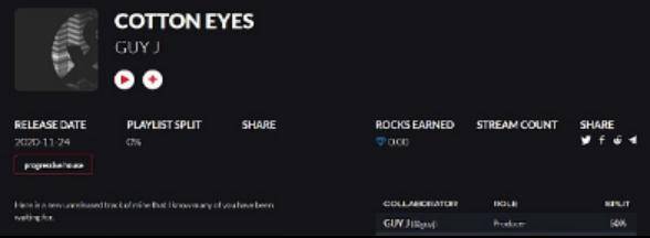 藝人 GuyJ 去年在 ROCKI 平臺發行了第一首 NFT 音樂,CottonEyes。這首歌曲在區塊鏈上擁有一枚 ERC721-NFT,標記其數字版權。本次 CottonEyes NFT 的拍賣在 bounce.finance 進行,經過 10 多個小時的參與者多次競價,最終某收藏家以 40 ETH 的價格購得這枚 NFT。