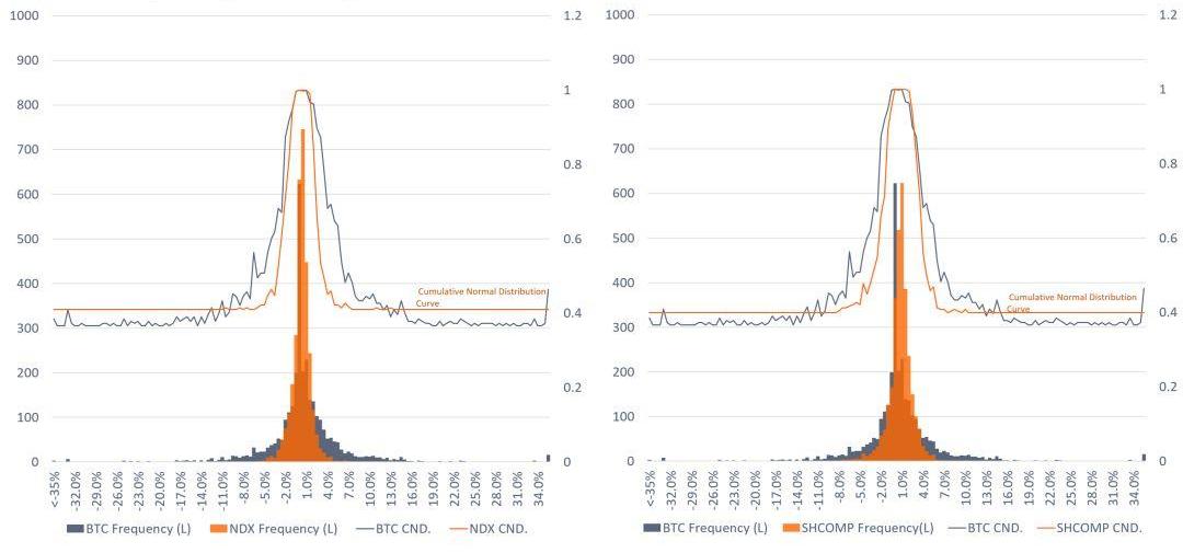 4.無論是在長周期還是短周期內,比特幣的回報與主流大類資產的相關性極低。且其收益率分布正偏且“肥右尾”,表現出極高的收益-風險比。