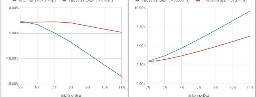圖11:含BTC組合對比不含BTC組合,在給定目標收益的最優風險配置下的回撤和波動對比