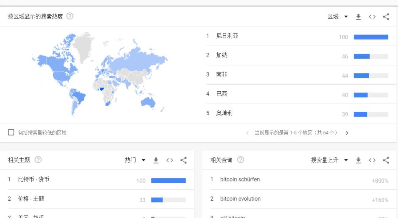 過去一天,全球Bitcoin的谷歌搜索相對值較前值有所上升,接近一個月中值。熱度排名前七的國家地區分別是尼日利亞、加納、南非、巴西、奧地利、德國和瑞士。在相關查詢詞中,今日搜索量上升位列第一的為bitcoinschürfen,昨日位列第一的bitcoinetf今日搜索量上升80%。過去一天,全球Ethereum的谷歌搜索相對值較前值有所回落,接近一個月低點。